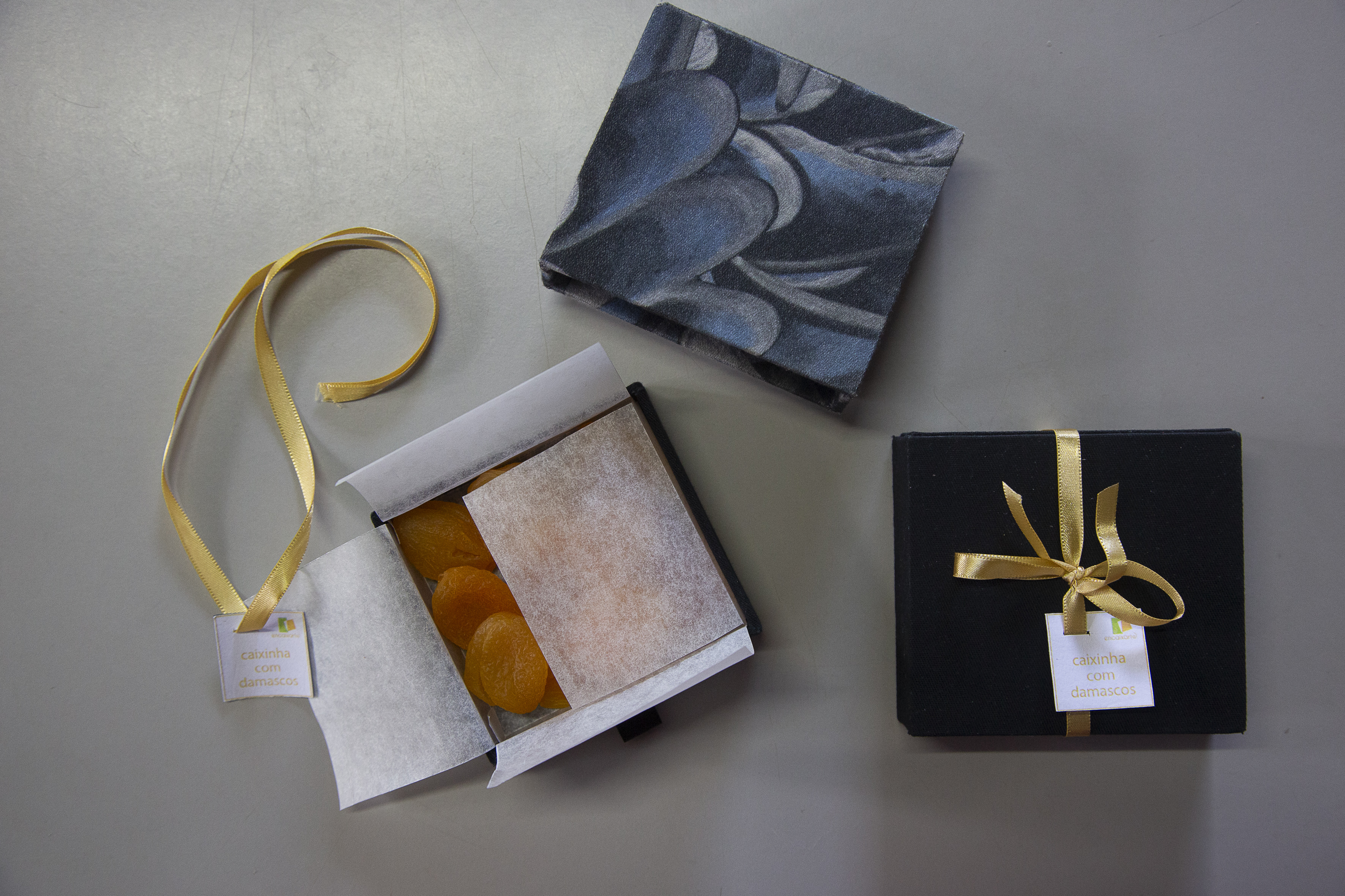 Caixa tipo gaveta com tecidos e tamanhos variados para presente. Pode ser usada etiqueta com logo em adesivo vinil em cima da caixa ou adesivo interno para fechar o conteúdo da caixa, que no caso, foi damascos. Arranjo com fita e etiqueta personalizada.