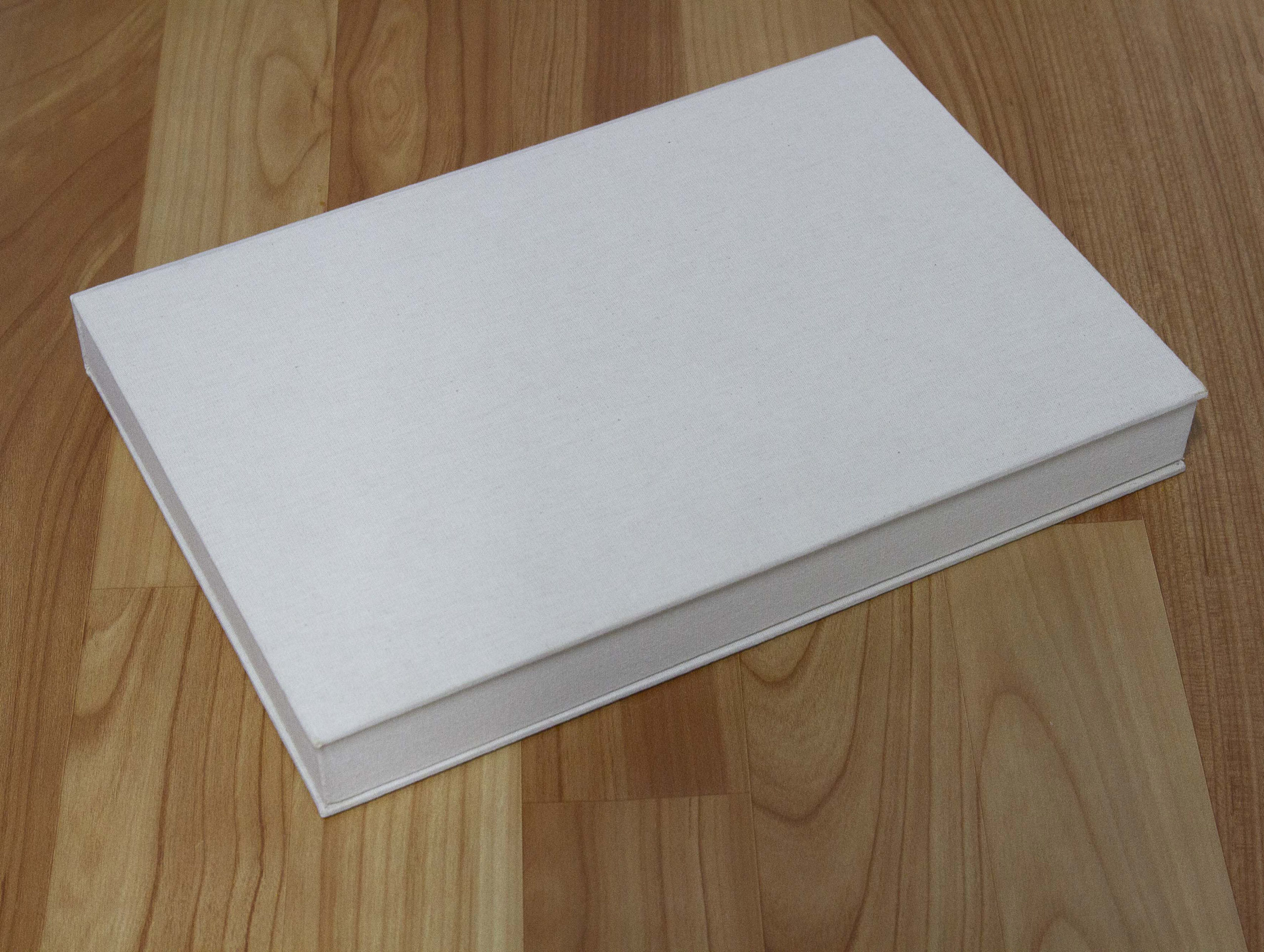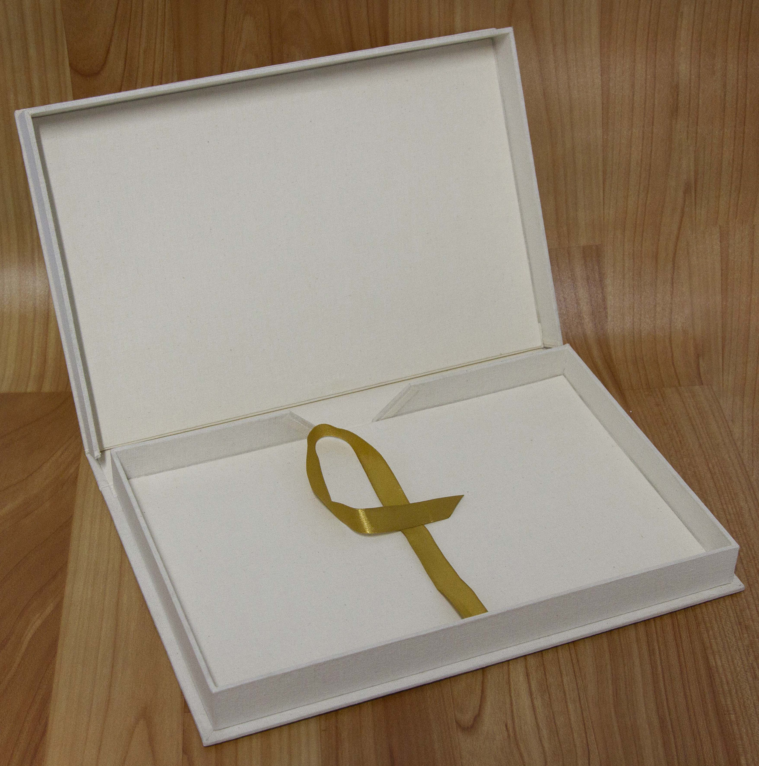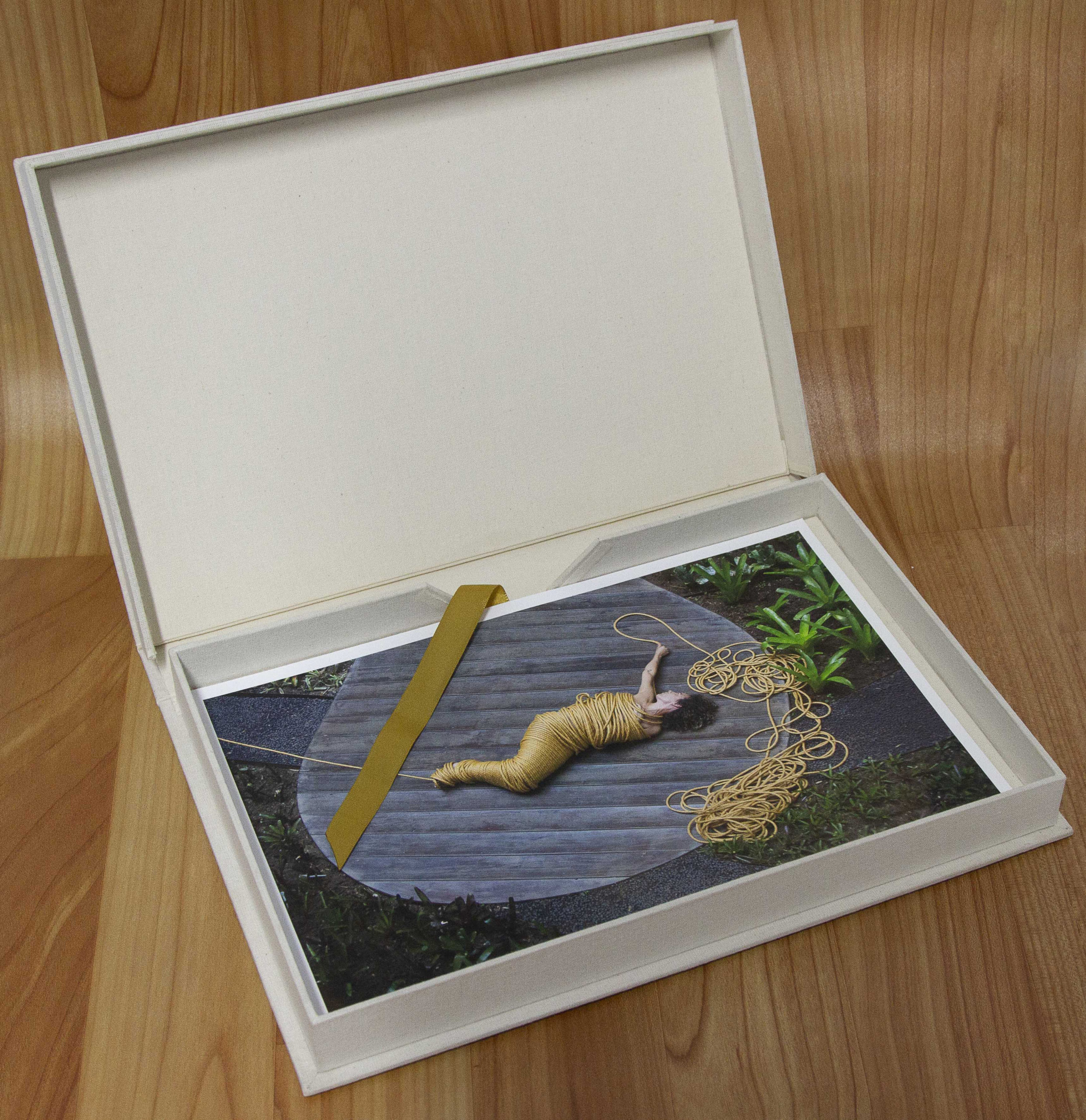 Caixa mostruário tipo “Solander” para fotos formato A4 e também Fine Art, ou seja em papel fotográfico 20,3 x 30,5cm. Tecido americano cru para harmonizar com as imagens que estarão no portfólio, uma vez que é um portfólio de casamento. Um tirante em fita dá o toque final, facilitando a retirada das fotos com delicadeza.