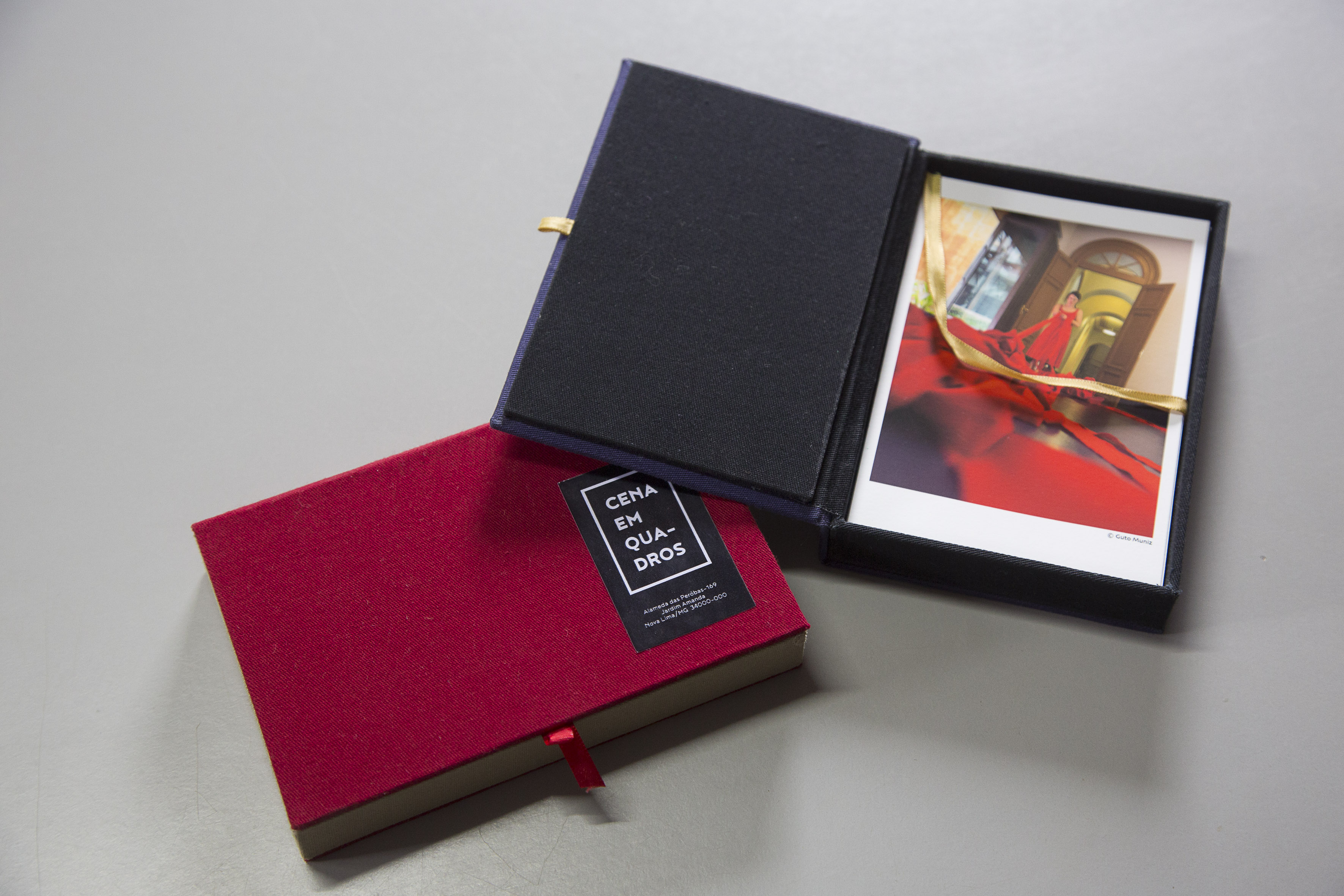 Caixa de fotos tipo “Cigar box” confeccionada para 12 unidades de 10x15cm, para a qual usamos duas cores do brim. O fechamento é feito pressionando levemente a tampa na base da caixa. Assim como na abertura da tampa, usamos um tirante em fita para levantar as fotos. A amplitude da tampa é de 180 graus.