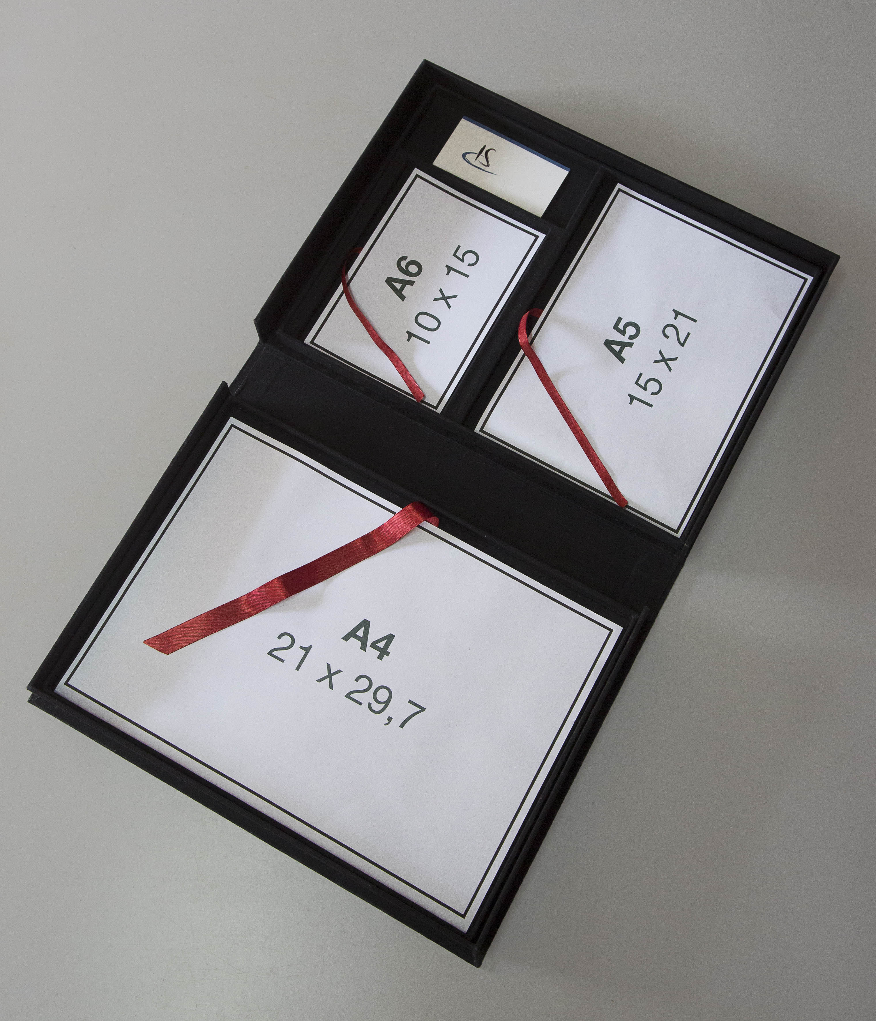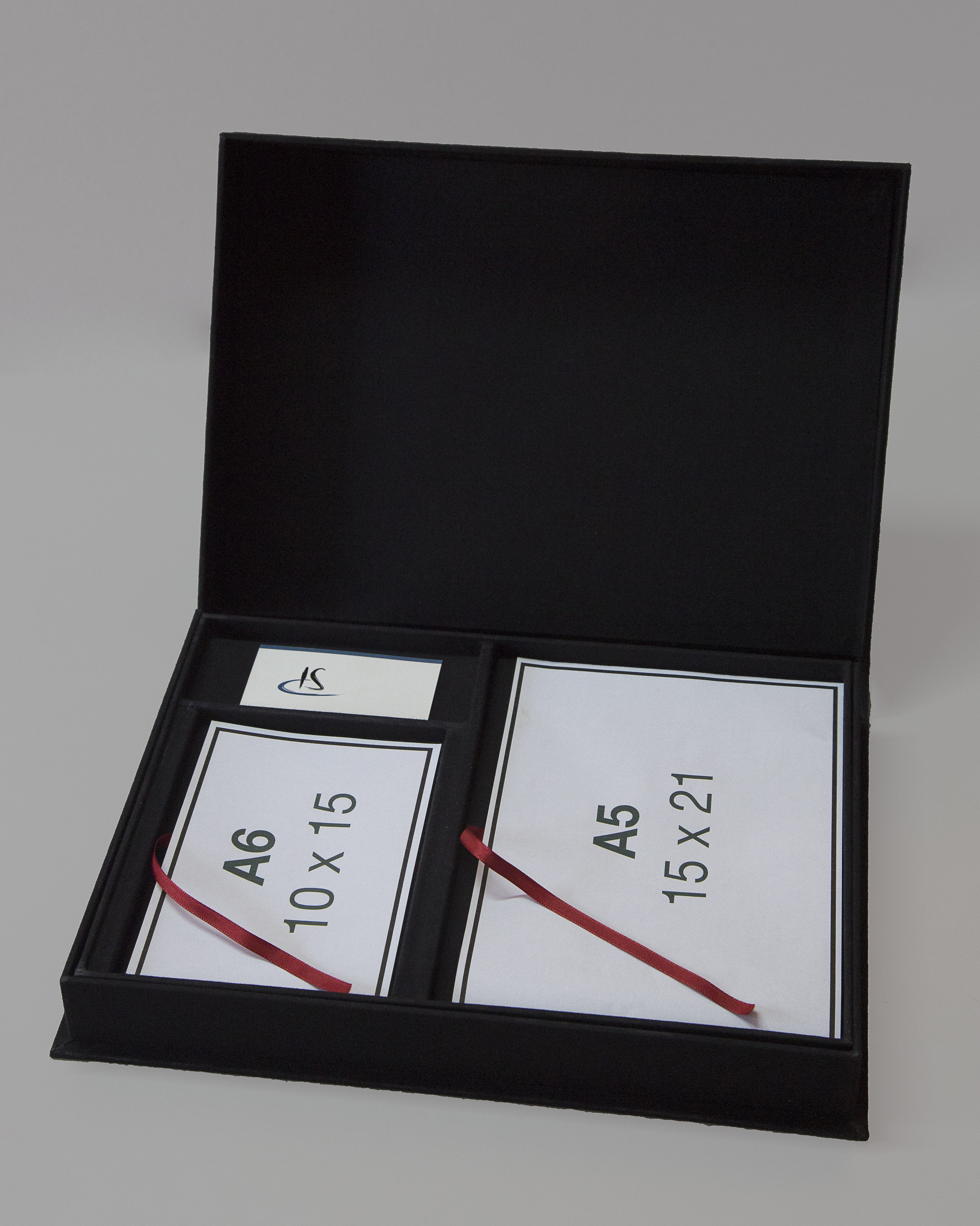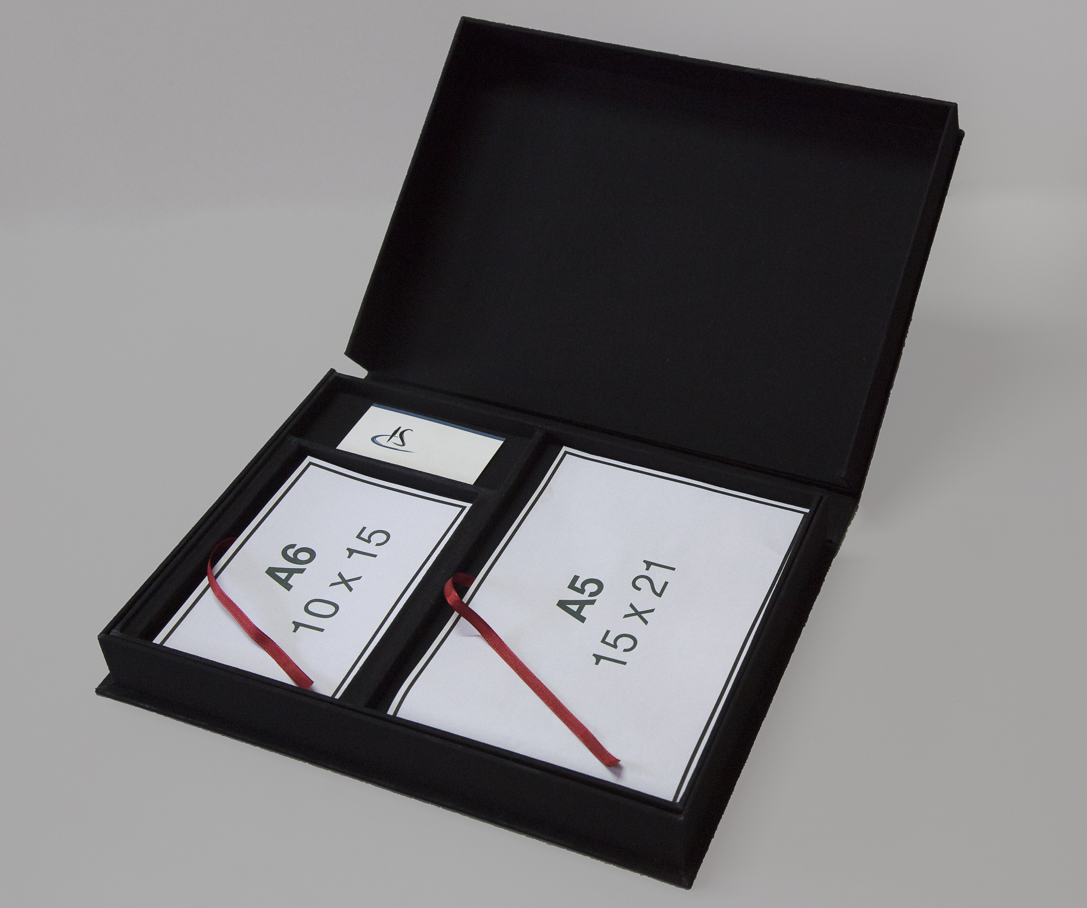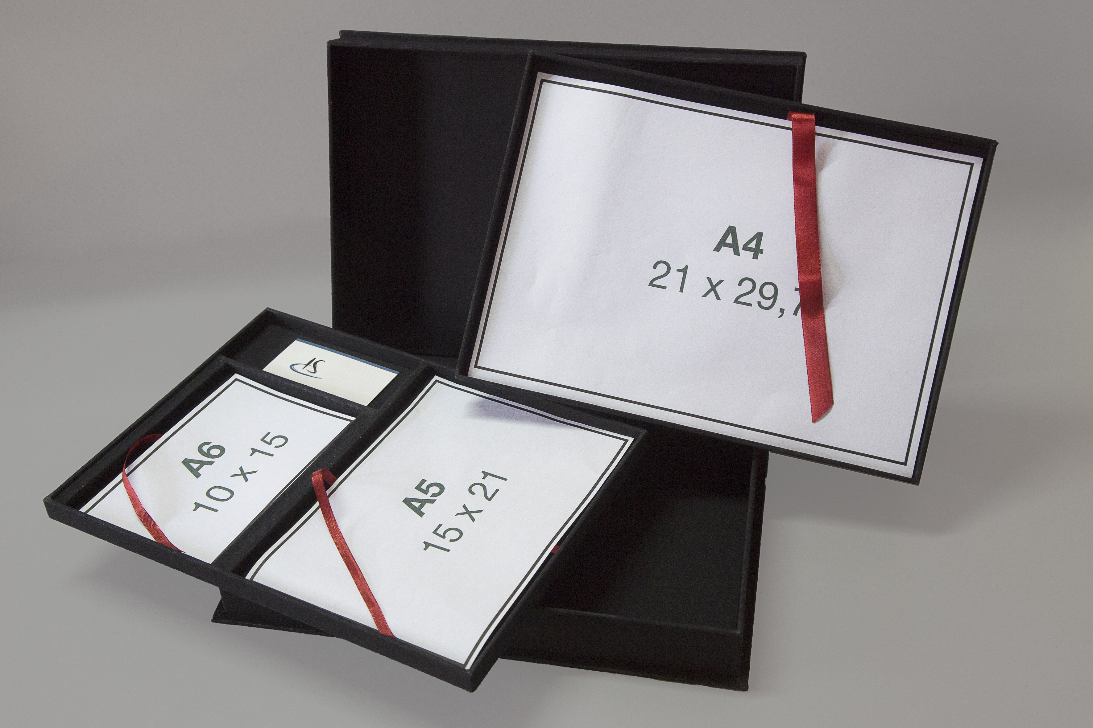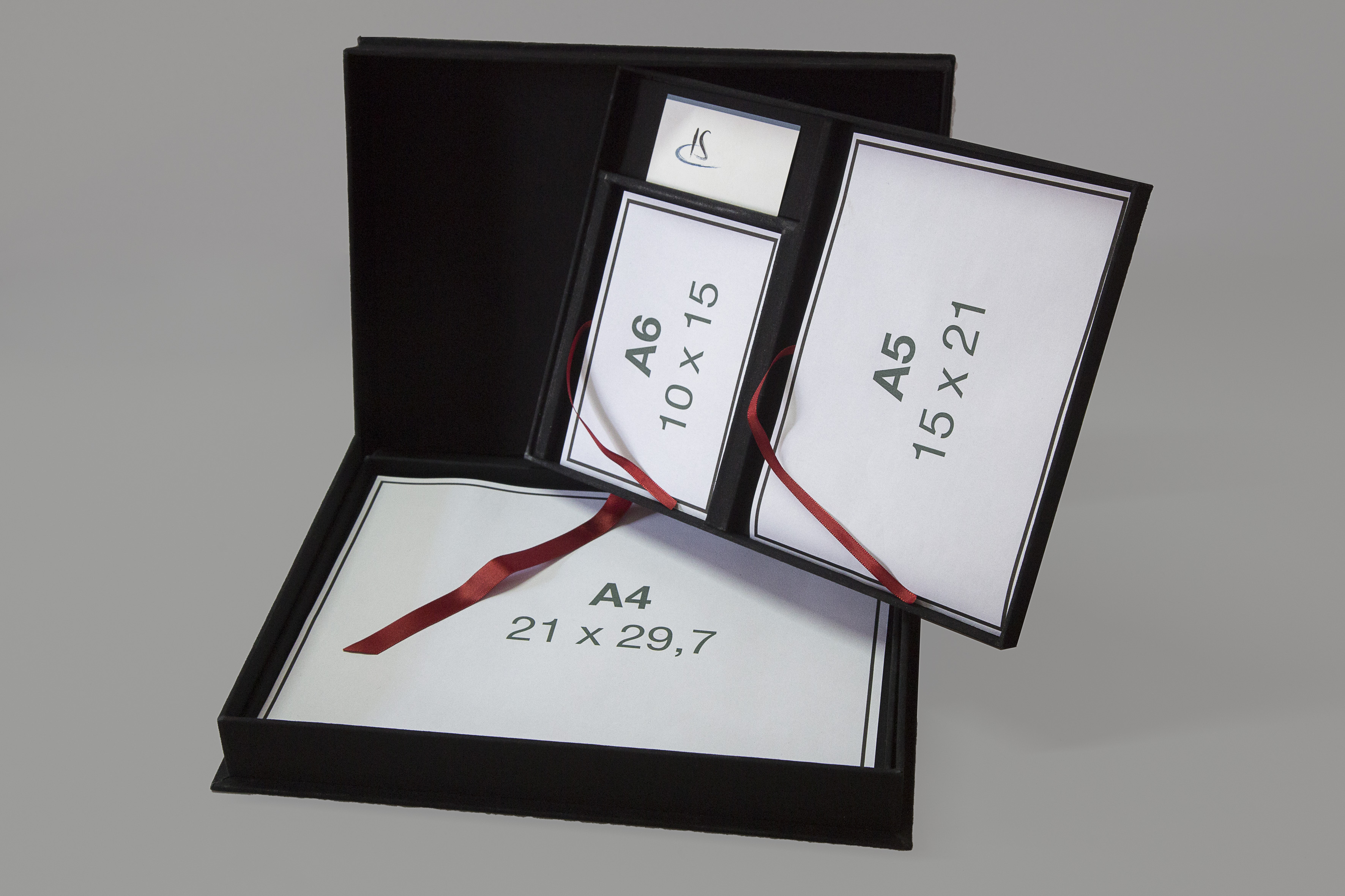 Caixa mostruário tipo “Solander” para fotos formato A4, A5, A6 e um espaço para cartões de visita, sendo Ideal para portfólio de fotografia, ilustrações, gravuras e aquarelas. Também pode ser confeccionada com dois compartimentos 10x15cm, porém neste caso não haverá local para cartão de visita. O uso do tecido “brim” preto, que é nossa especialidade, ocorre para harmonizar com as imagens que estarão no portfólio. Um tirante em fita em cada compartimento de fotos dá o toque final, facilitando a retirada das fotos com delicadeza.